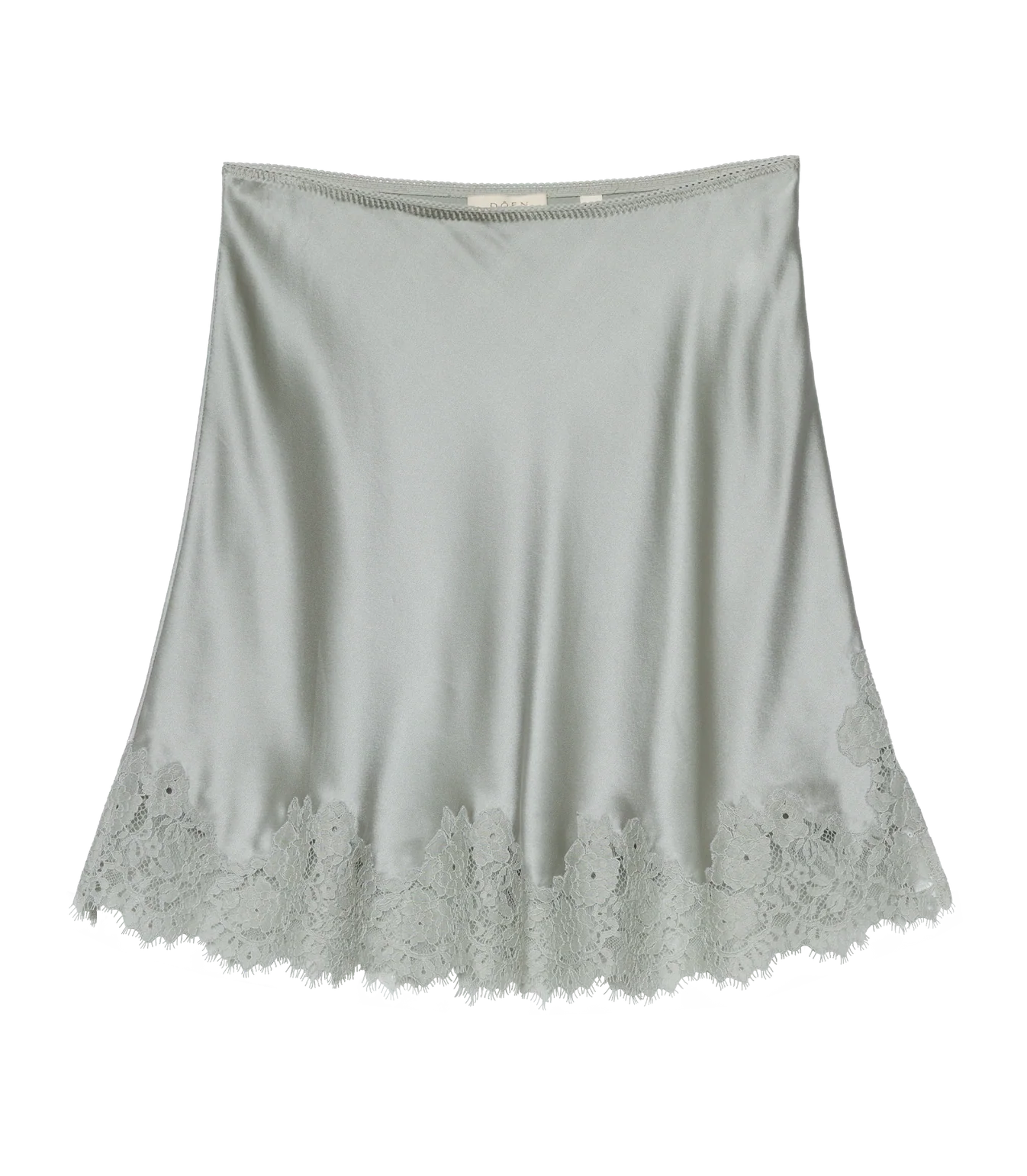 Crafted from buttery silk satin, the Giulietta is a bias-cut mini skirt, finished with delicate scalloped elastic at the high waist and romantic floral lace along the hem.