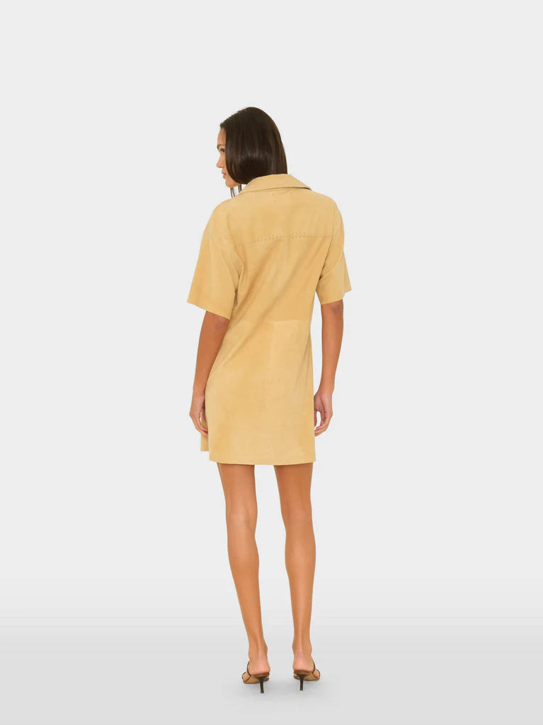 Suede Story. Chloe is new this season in our soft and supple goat suede. This short-sleeve mini dress features a snap button-front, whipstitch details, and a left chest pocket.