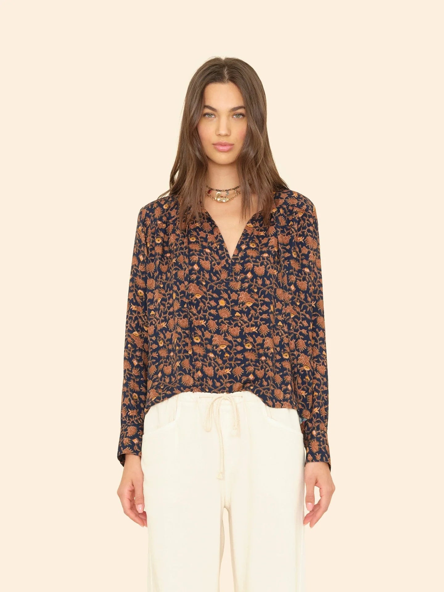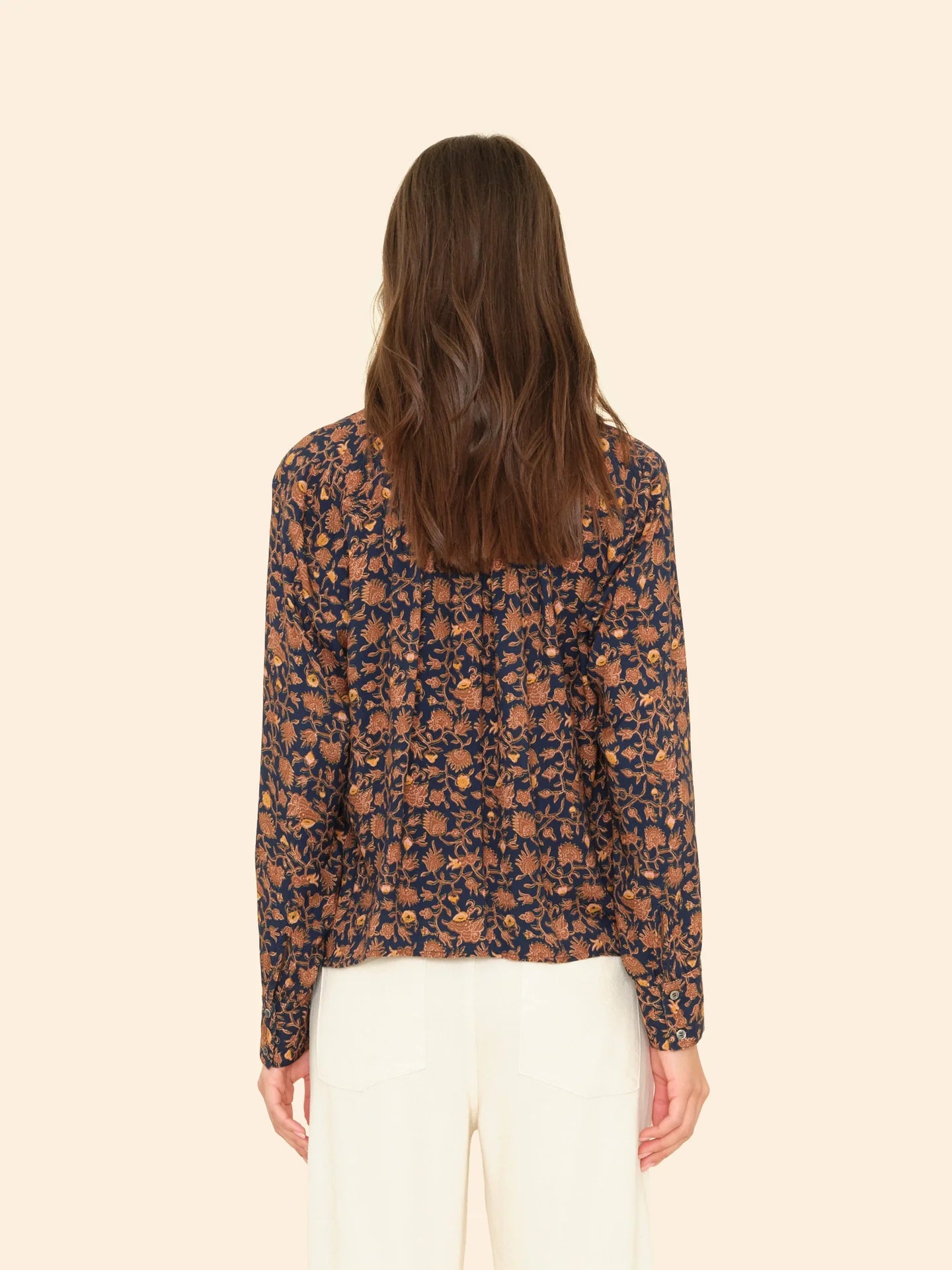 Flower Power. Monika is new this season in our enchanting floral printed rayon. This femme blouse features a split neck with self-tie detail and shirred front and back yokes.