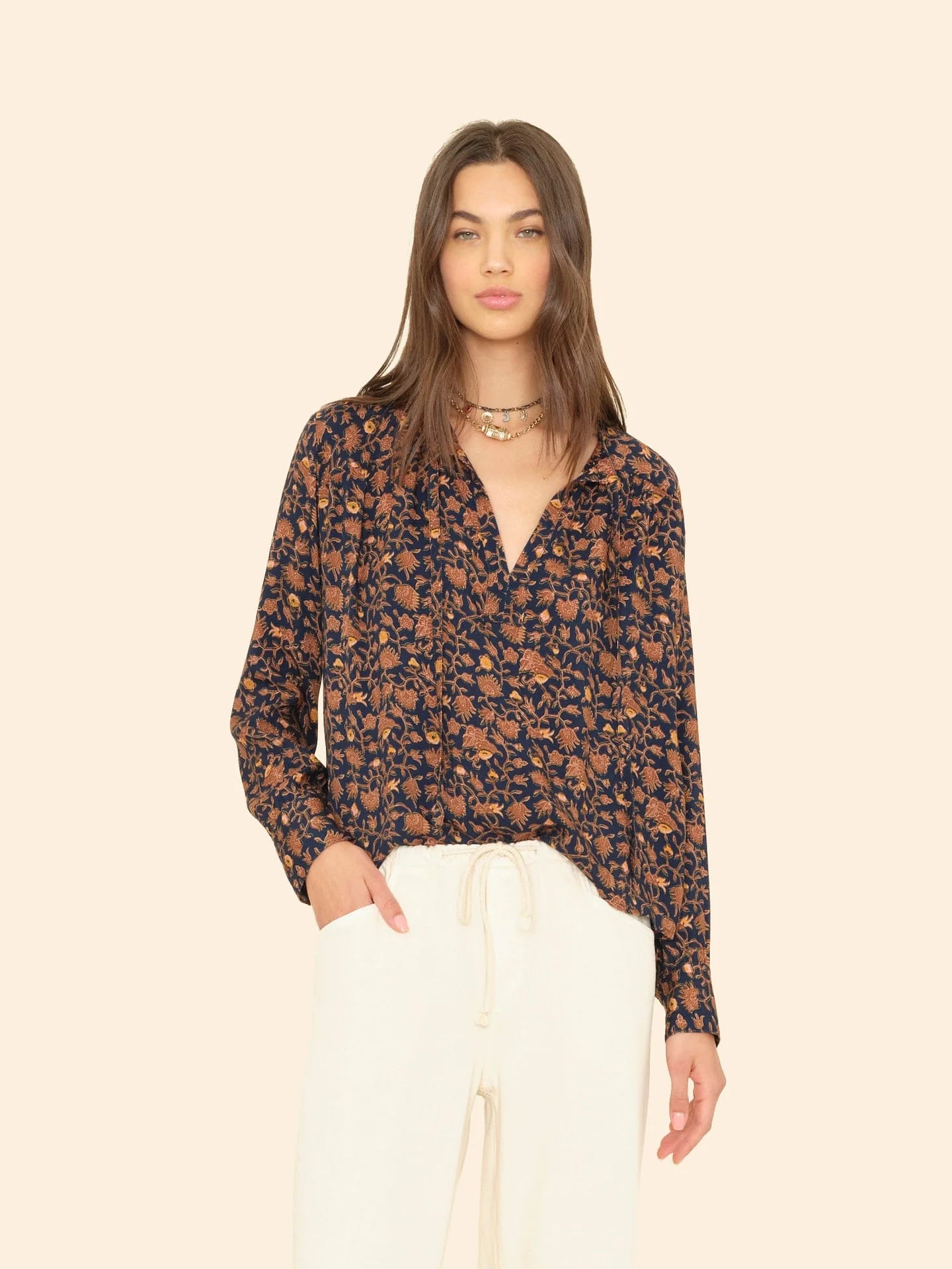 Flower Power. Monika is new this season in our enchanting floral printed rayon. This femme blouse features a split neck with self-tie detail and shirred front and back yokes.